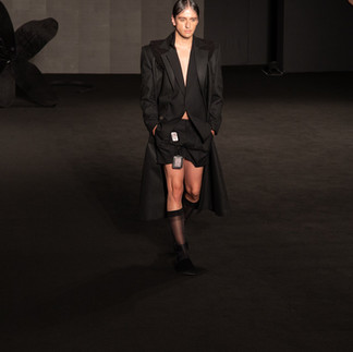 El desfile, encargado de inaugurar las pasarelas de Plaza Mayor durante la feria, abrió con un imponente lirio negro al centro del escenario, captando de inmediato la atención del público. A partir de allí, los modelos recorrieron la pasarela al ritmo de sones antioqueños, luciendo prendas vanguardistas en tonos tierra, blanco, beige, gris y negro. El estilismo se enriqueció con detalles como corbatas y accesorios tejidos, ramos de flores beige que emergían de espaldas y bolsillos, y bolsos que evocaban el clásico carriel antioqueño.