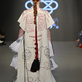La colección apostó por una paleta sobria —blanco hueso, negro, beige— con acentos de rojo y azul grisáceo que aportaron contraste y profundidad. Las siluetas fluidas, los materiales naturales como el algodón y la lana, y los detalles artesanales mostraron cómo es posible integrar herencia cultural y diseño de autor sin concesiones.